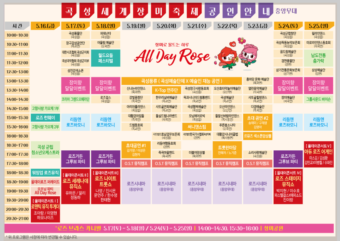 | 음악공연 | 아듀 로즈 어게인 | 김성환, 수와진, 미스김 출연 | 5월 25일(일) 16:30 | 중앙무대 | 폐막 콘서트 |