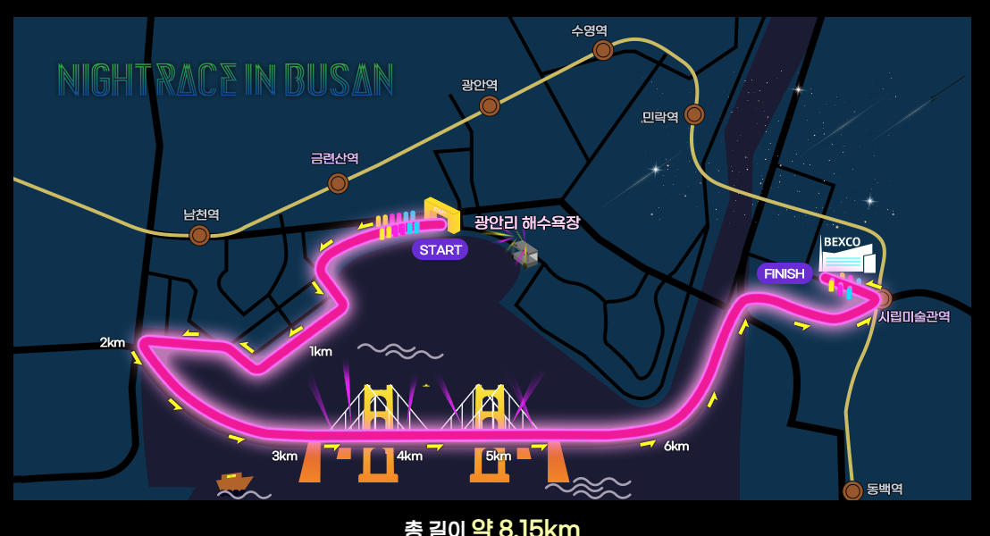 | 주요 코스 | 광안리 → 광안대교 → 벡스코 앞 도로 |