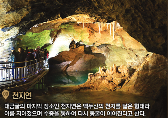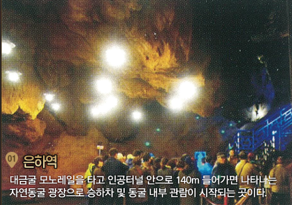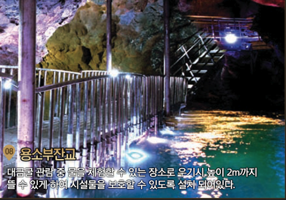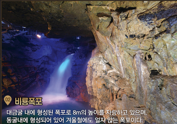 | 비룡폭포 | 8m 높이의 지하 폭포. 수직 낙수가 웅장한 분위기 연출 |