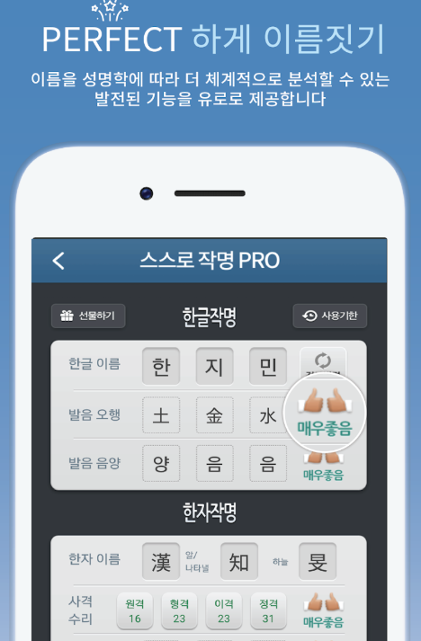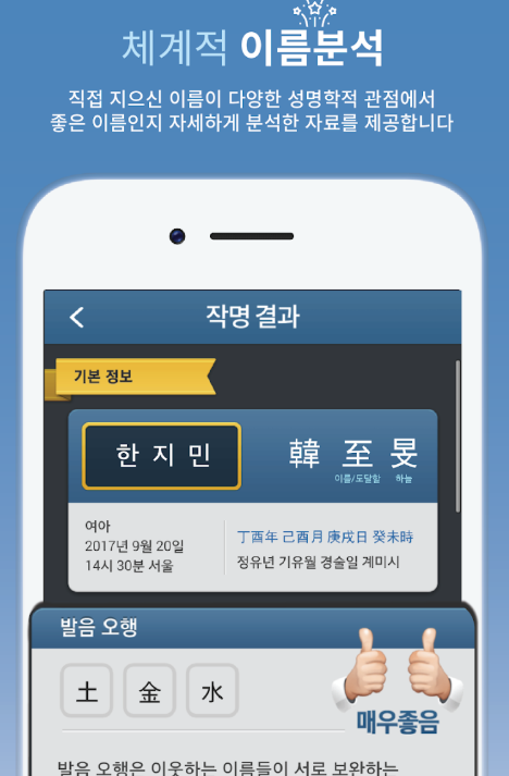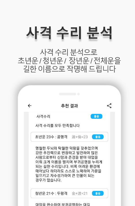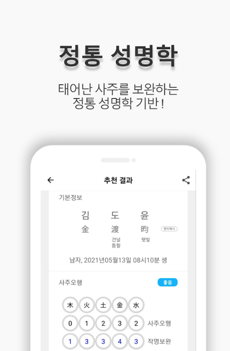 다만, 작명은 사주, 오행, 발음, 수리 등 다양한 요소가 복합적으로 작용하기 때문에, 결정이 어려운 경우에는 전문가와의 상담을 통해 좀 더 깊이 있는 분석을 받아보는 것도 고려해보세요. 어플은 참고 도구로 활용하고, 최종 이름은 가족과 함께 충분히 고민하여 결정하는 것이 가장 좋습니다