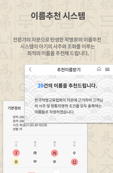 - 추천 이름 제공: 사주 분석 후 적합한 한자 이름 제시