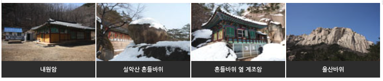 권금성코스 | 설악동 | 약 1.6km / 1~2시간 | 초급 | 케이블카, 권금성 전망대 | 등산보다는 관광에 가까운 짧은 산책 코스 |