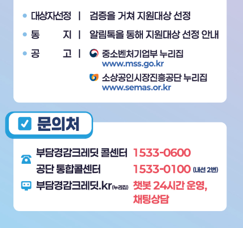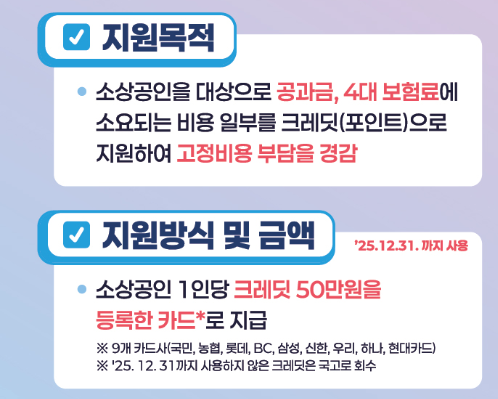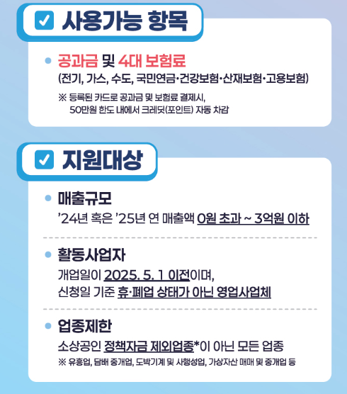 | 지원금은 어디에 쓸 수 있나요? | 전기, 가스, 수도요금과 국민연금, 건강보험, 고용·산재보험 등 사업자 부담 고정비 결제 시 자동 차감됩니다. |