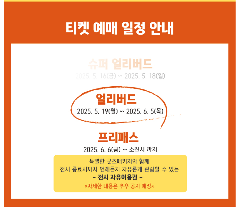 | 얼리버드 티켓은 언제부터 구매할 수 있나요? | 2025년 5월 16일(금) 오전 10시부터 인터파크 티켓에서 예매 가능합니다. |