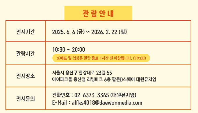 | 어린이도 관람이 가능한가요? | 네, 모든 연령이 관람 가능하며 어린이와 함께 방문하기에 적합한 전시입니다. |