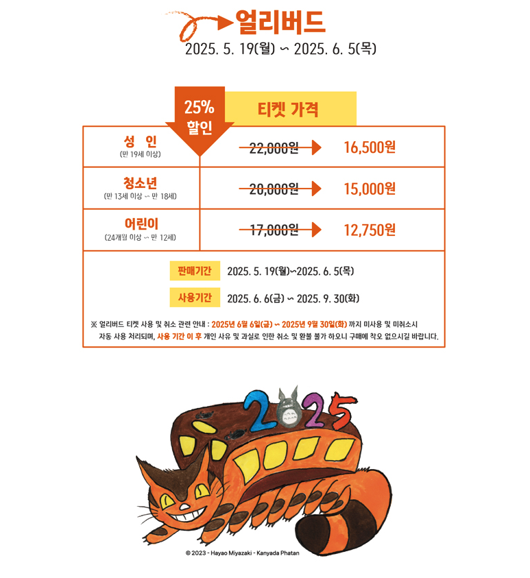 얼리버드 할인으로 저렴하게 관람하고, 꿈같은 지브리의 세계를 가까이에서 만나보세요.