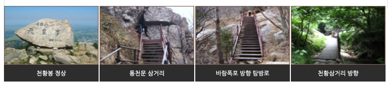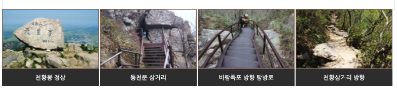 | 천황봉 코스 | 약 5.6km | 약 4시간 30분 | 중~상 | 가장 인기 있는 코스로 정상까지 오르는 대표 루트 |