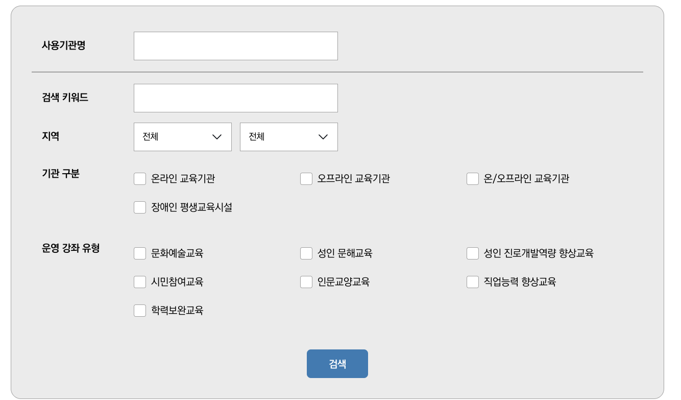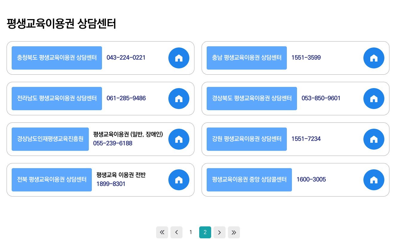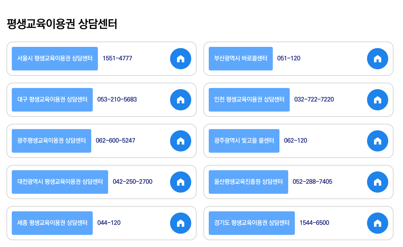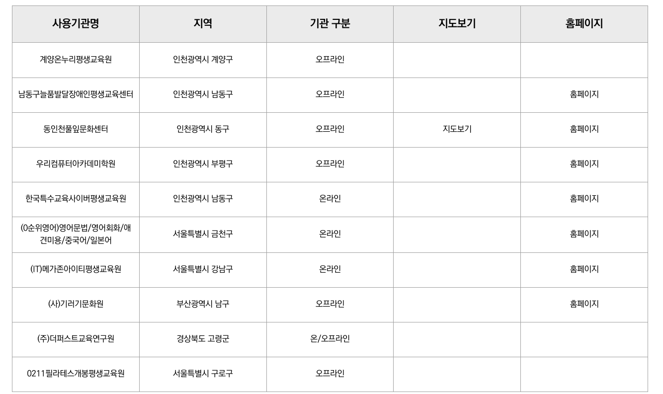 | Q. 사용 가능한 기관은 어디서 확인할 수 있나요? | 평생교육이용권 공식 누리집(www.lllvoucher.or.kr)에서 ‘사용처 조회’ 메뉴를 통해 지역별, 분야별로 검색할 수 있습니다. |