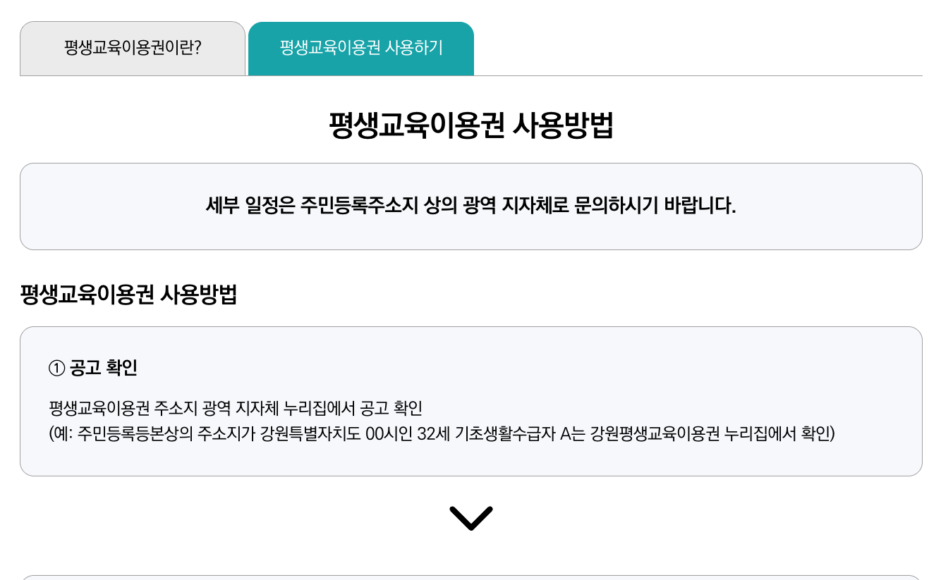 | Q. 평생교육이용권은 누가 신청할 수 있나요? | 기존 저소득층 외에도 일반 국민, 장애인, 고령자, 디지털 취약계층 등으로 확대되었습니다. |