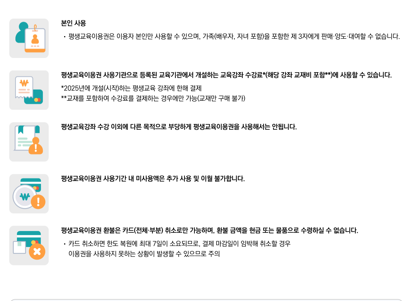 | Q. 가족이나 지인에게 이용권을 대신 써도 되나요? | 아니요. 평생교육이용권은 본인만 사용할 수 있으며, 타인에게 양도, 대여, 판매하는 것은 금지되어 있습니다. |