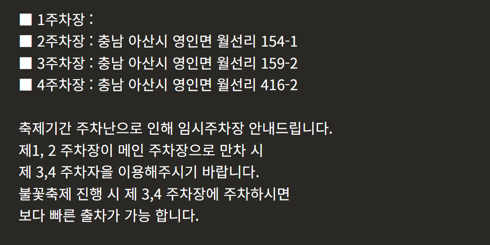 피나클랜드 불꽃축제는 자가용으로 방문하는 분들이 많아, 원활한 입장을 위해 축제 기간 동안 임시 주차장이 함께 운영됩니다.
