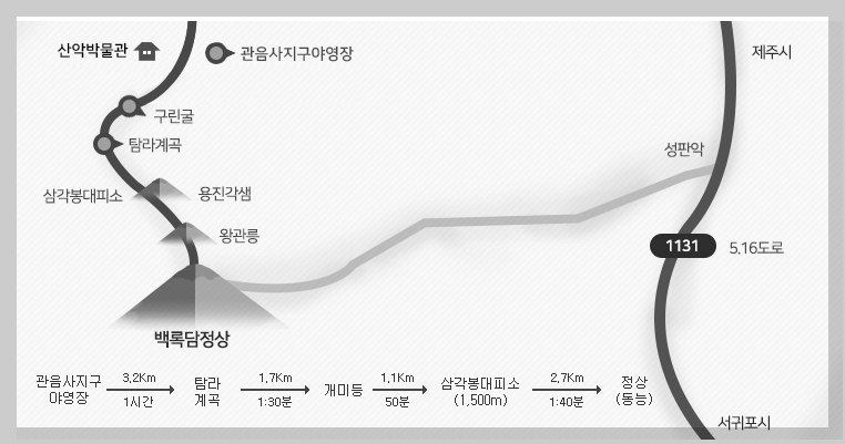 | 특징 | 계곡 풍경이 압권 구린굴, 탐라계곡 등 학술적 가치 높은 지형 포함 왕관릉 구간은 고난도 |