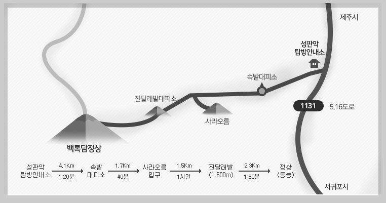 | 특징 | 숲이 많아 여름에도 시원 사라오름 전망대 경유 진달래밭 이후부터 난이도 상승 |