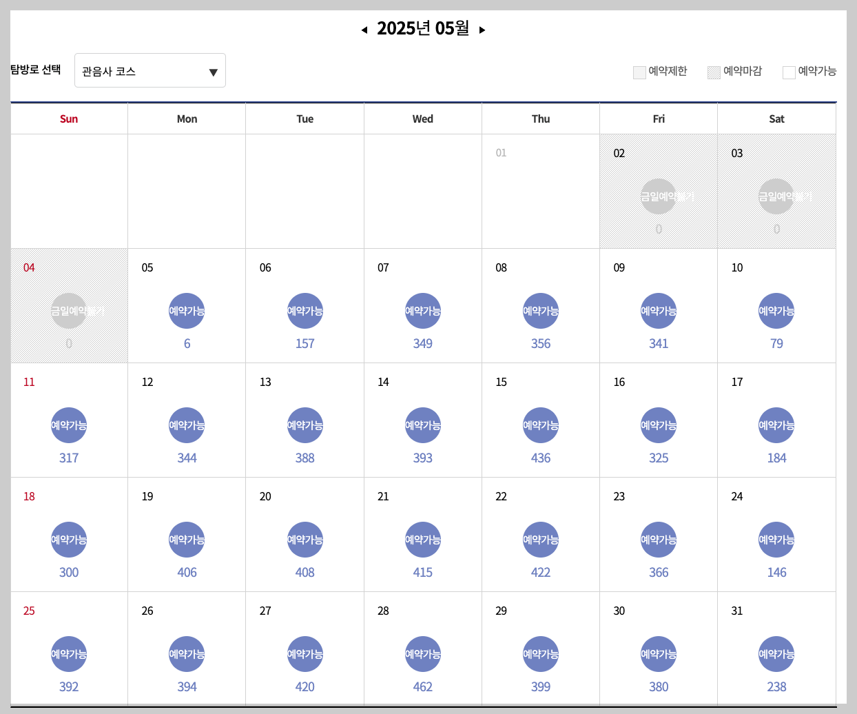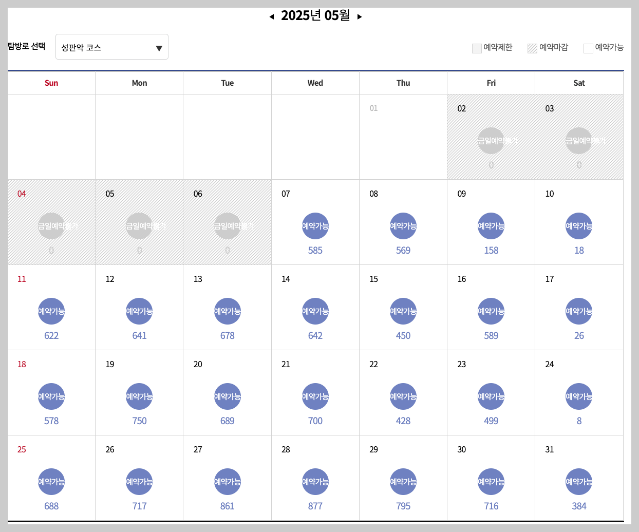 위 예약현황을 보시다시피 성판악코스가 관음사코스보다 예약마감이 빠릅니다. 더불어 휴일에는 예약마감이 일찍되는바 참고하시기 바라겠습니다.