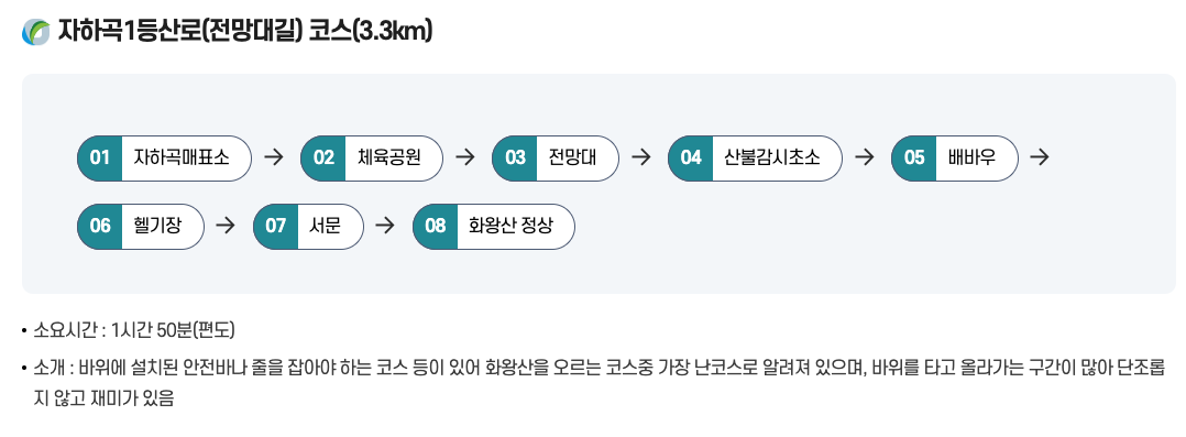 | 가장 빠르게 정상 도달 가능 | 경사가 가파르고 체력 소모 큼 |
