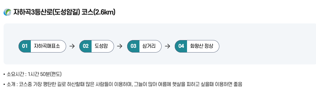 | 빠른 산행 | 도성암 코스 | 짧은 거리, 정상까지 빠르게 도달 |