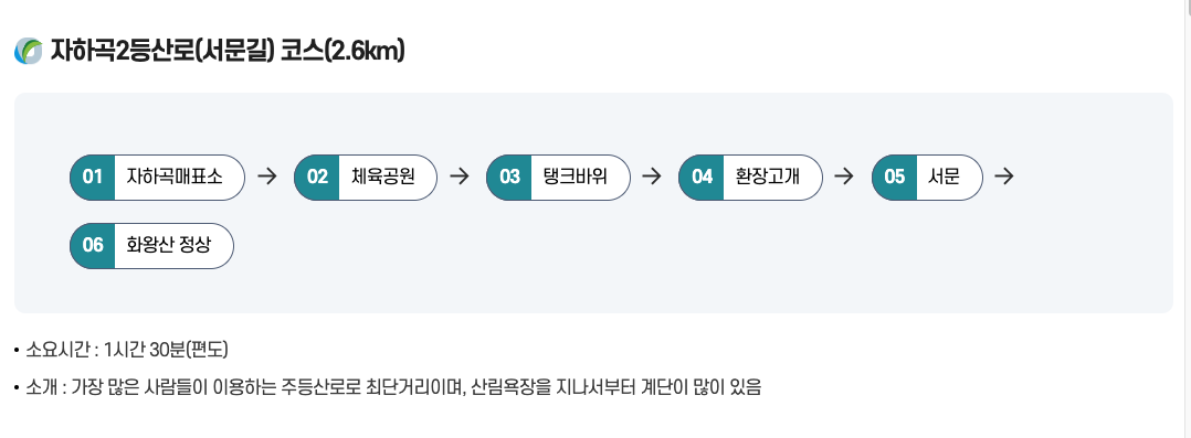 | 아이들과 함께 가도 괜찮을까요? | 자하곡 코스와 자연휴양림 내 산책로는 아이들과 함께 걷기 좋은 코스입니다. 체험 프로그램도 있어 가족 단위 여행에 적합합니다. |
