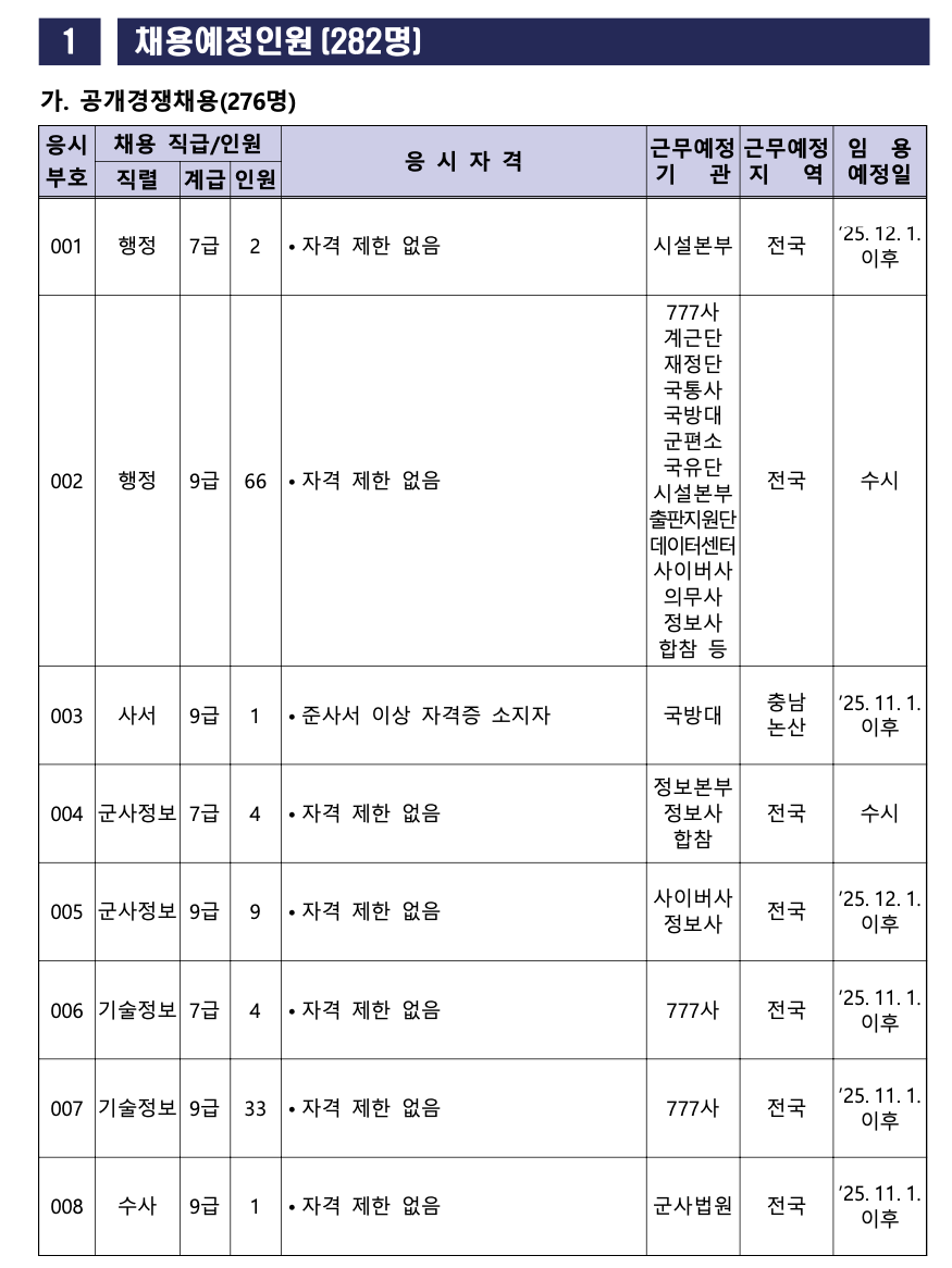| 기술직 | 장비 정비, 탄약관리, 전산 시스템 운영 |