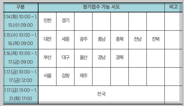 각 회차의 정기 접수 종료 후 약 1주일 후부터 추가 접수가 가능합니다. 접수 기간을 놓친 경우 추가 접수 기간을 활용하시기 바랍니다.