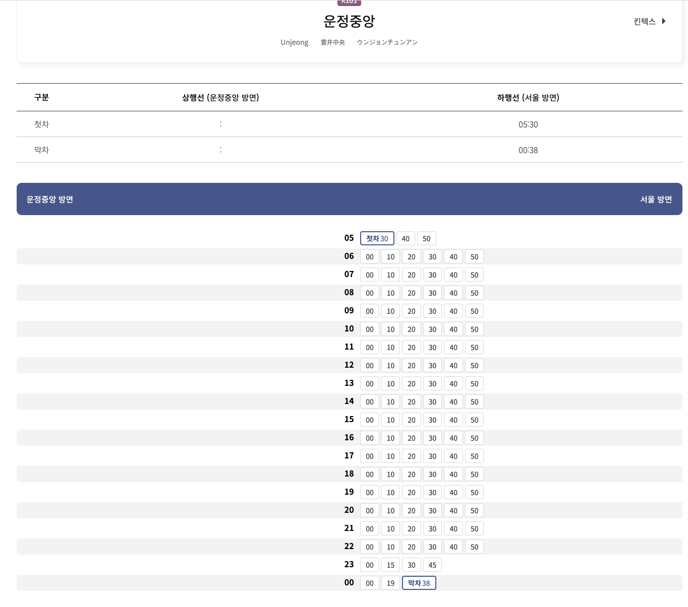 | 운정 | 05:30 | 23:50 |