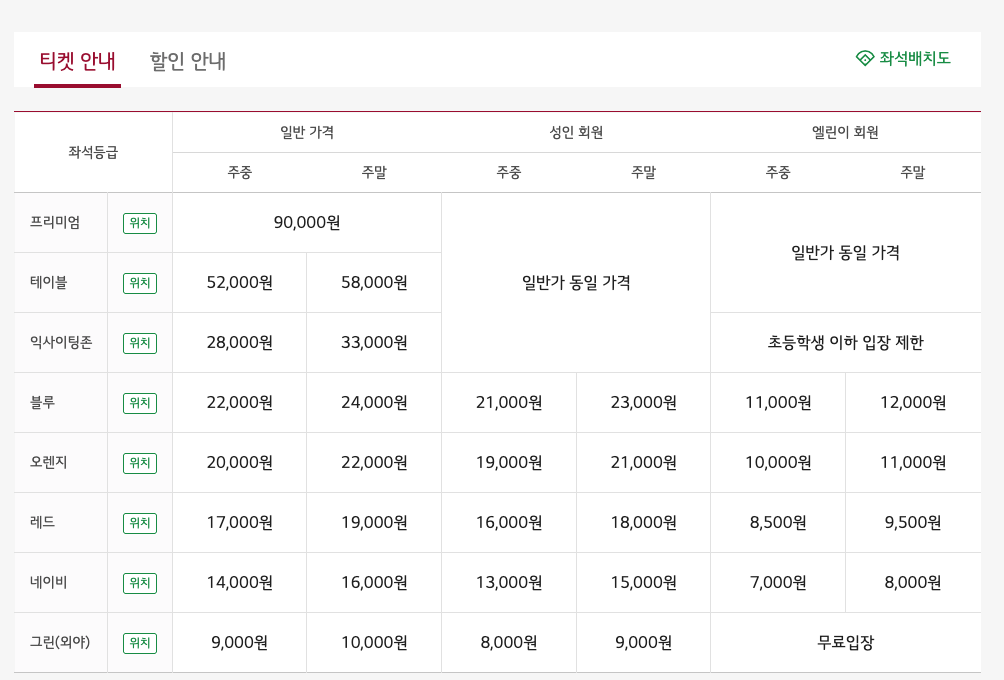 좌석 가격표 (2025년 기준)
